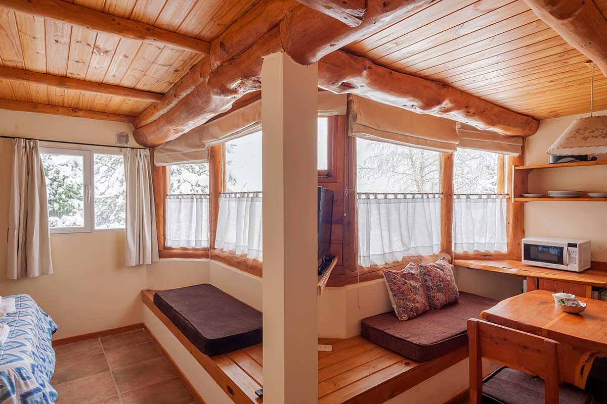 Hermoso y cómodo monoambiente en PB, con vista al Cerro Catedral, cocina con encendido eléctrico, cuatro hornallas, horno y parrilla, equipamiento para 2 personas (4 platos, 4 vasos, cubiertos y demás), heladera bajomesada con congelador, microonda, cafetera eléctrica y tetera eléctrica. Dos camas de 1 plaza o juntas cama matrimonial de 1.60 ancho. Baño completo con hidro y secador de cabello. Calefacción de loza radiante. Televisión LCD 40″, Directv. Luz de emergencia.